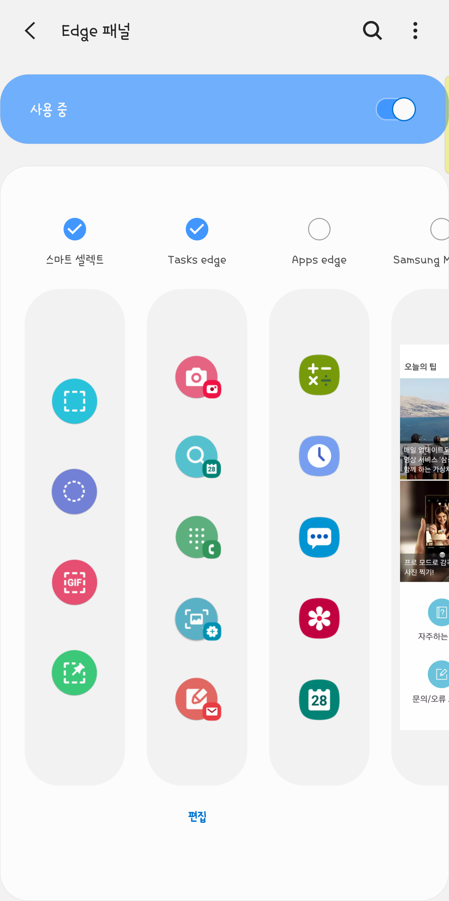 Edge패널에서 "Tasks edge"를 체크해주시고 편집을 누르면